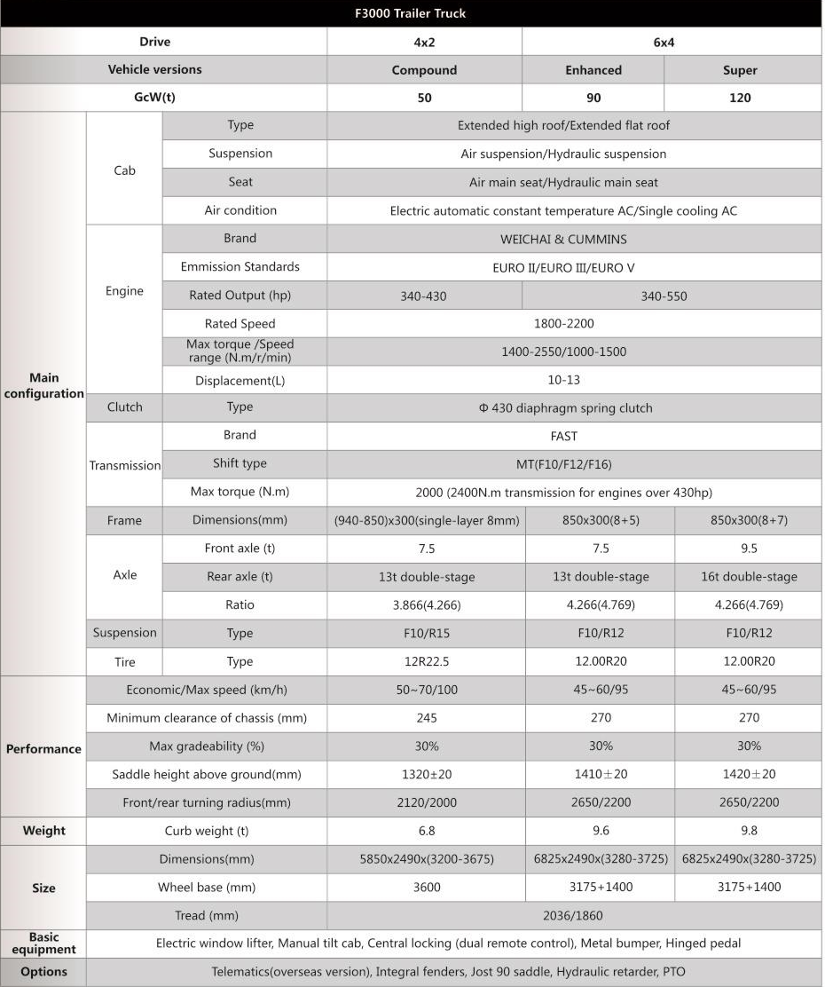 विवरण के संदर्भ में, पावर सिस्टम ऑफ़ शाकमैन F3000 6x4 और 4x2 हेड ट्रैक्टर ट्रक Weichai या Commins हाई-पावर इंजन से लैस है। ट्रांसमिशन सिस्टम तेजी से 12-स्पीड या 16-स्पीड मैनुअल ट्रांसमिशन के साथ मानक आता है, और कुछ मॉडल एएमटी ऑटोमैटिक ट्रांसमिशन से लैस हैं। कैब उच्च छत या विस्तारित फ्लैट छत के साथ उपलब्ध हैं, और आंतरिक सुविधाएं जैसे कि एयरबैग शॉक-अवशोषित सीटें और स्वचालित एयर-कंडीशनिंग सभी उपलब्ध हैं। चेसिस और सस्पेंशन मैन टेक्नोलॉजी को अपनाते हैं, और एयर स्प्रिंग्स का उपयोग कुछ मॉडलों के रियर सस्पेंशन में आराम और लोड-ले जाने की क्षमता को बढ़ाने के लिए किया जाता है।
