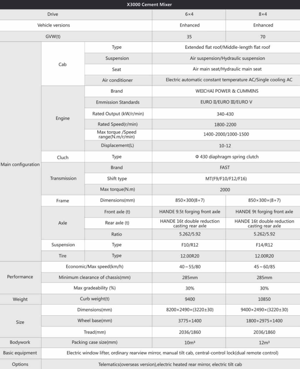 चेसिस वूसी चाइवेई WP10/WP12 इंजनों से सुसज्जित है, जिसमें अधिकतम शक्ति 350 से 460 हॉर्सपावर तक है। यह FATAI 12-स्पीड ट्रांसमिशन और हांड मैन तकनीकी एक्सल के साथ मिलान है, जो जटिल निर्माण स्थल स्थितियों के लिए उपयुक्त है। कैब चार-पॉइंट सस्पेंशन डिज़ाइन को अपनाता है और एयरबैग शॉक-अवशोषित सीटों से लैस है, जिससे ड्राइवर के आराम को काफी बढ़ाता है। टैंक की सतह एंटी-जंग सैंडब्लास्टिंग उपचार से गुजरती है, और कंक्रीट को पालन करने से रोकने के लिए एक वैकल्पिक स्प्रे सिस्टम स्थापित किया जा सकता है। रियर डिस्चार्ज च्यूट 270 डिग्री को घुमा सकता है, और ऑपरेशन लीवर को वाहन के दाईं ओर केंद्रीय रूप से व्यवस्थित किया जाता है, जो एकल-व्यक्ति सटीक नियंत्रण की सुविधा प्रदान करता है। पूरा वाहन राष्ट्रीय VI उत्सर्जन मानकों का अनुपालन करता है और शहरी निर्माण परियोजनाओं के लिए एक कुशल और पर्यावरण के अनुकूल कंक्रीट परिवहन समाधान है।